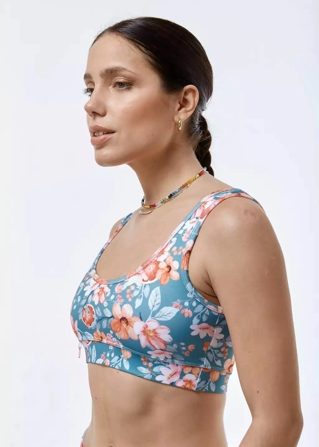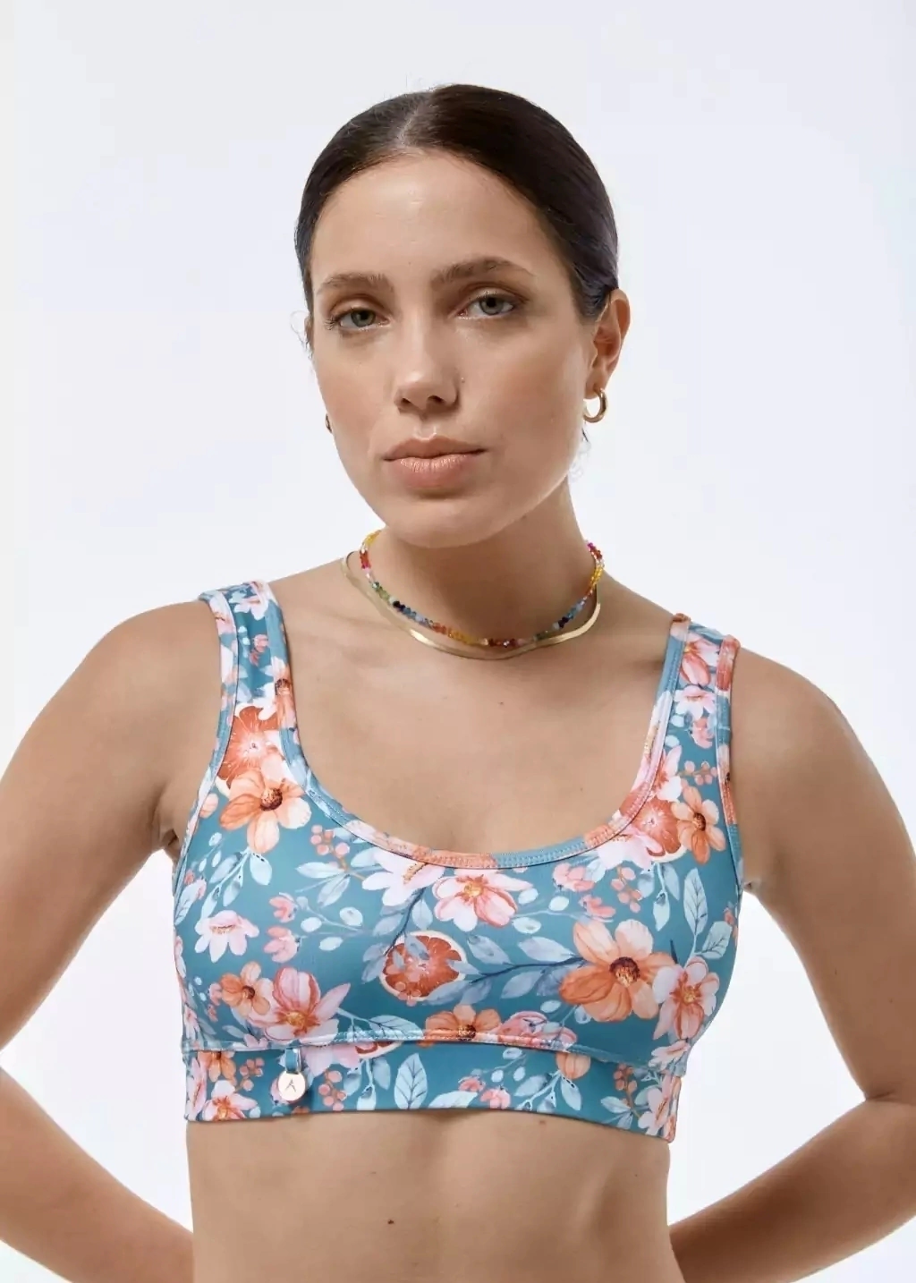 Top bikini sublimada en tela tricot. Su tejido ligero y flexible hace que este producto tenga doble rebote y ajuste perfecto.